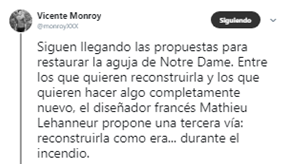 Entre las numerosas propuestas recibidas por el estado francés, a quien pertenece la antigüedad del edificio, para la reconstrucción de la torre, el arquitecto francés Mathieu Lehanneur propone restaurar la torre de Notre Dame tal y como fue durante el incendio. Una resolución desde luego original, que se separa de los tradicionalistas, quienes defienden una nueva torre como lo era la antigua (los más apoyados), y los innovadores, entre cuyas sugerencias estaba la creación de un techo y una aguja de cristal para Nuestra Señora. Lehanneur se atreve, lanza su grito a un vacío en el que resonará sin que nadie lo perciba: aunar pasado y presente, recoger el accidente e inmortalizarlo, crear un futuro desde la ceniza.