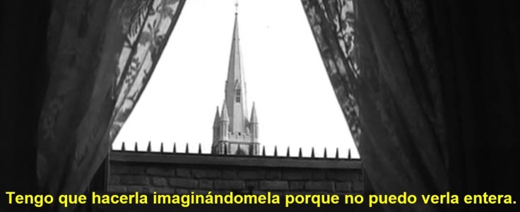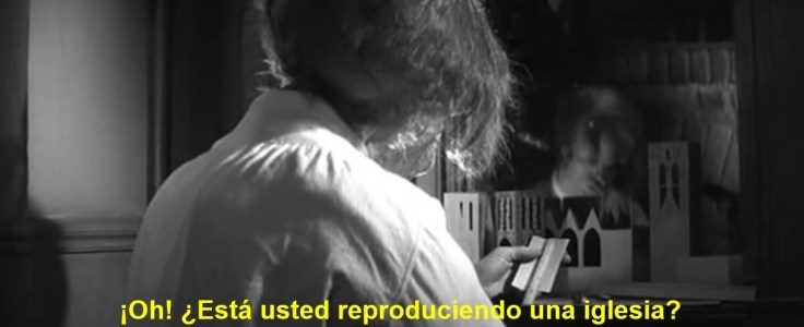 Cuando entra en la habitación, El Hombre Elefante estaba ocupado construyendo una maqueta de un edificio en su escritorio. Acto seguido, la actriz pregunta al protagonista si está reproduciendo la catedral que hay en frente de su casa (es decir, si está ‘copiando el original’ o ‘volviendo a hacer presente lo que antes hizo otro’), a lo que él responde que no, pues él tiene que hacerla imaginándosela, no viéndola (es decir, tiene que ‘producir algo, darle el primer ser’). Desde su ventana tan solo podía ver una torre, una pequeña parte de todo el conjunto: no tenía conocimiento del puzle entero, solo de algunas piezas aisladas. Partiendo de esa punta del iceberg, El Hombre Elefante debía deducir el 90% restante que yacía bajo el agua, fuera del alcance de su ventana.