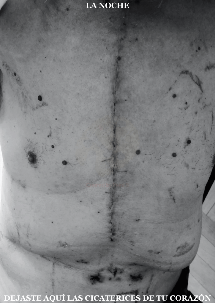 Abajo está la noche. Acabas de salir de una operación a corazón abierto y me ves, pero seguramente es un efecto de la anestesia. Estuviste clínicamente muerto. Ahora yo también estoy listo para morir, solo que a diferencia tuya hijo tengo 31 años y me apena morir tan joven…