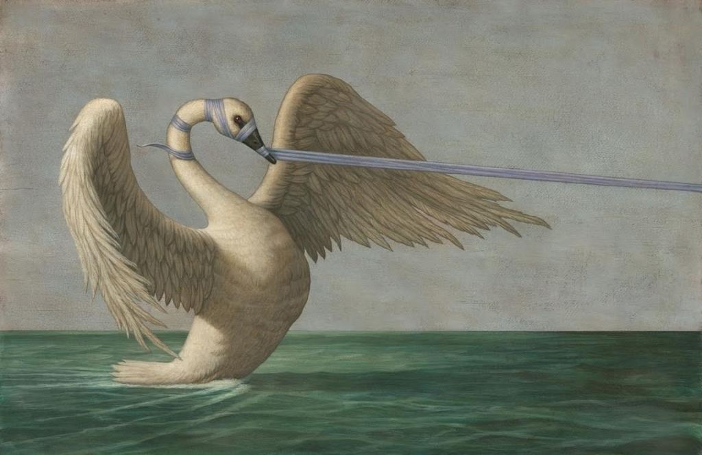 La elección de la ilustración de la portada fue una «feliz coincidencia» como dijo Paulina. En ella vemos a un cisne atado que está siendo atraído por una fuerza que permanece fuera de plano. Cuando leemos la información del libro en las primeras páginas vemos que el autor es Marc Burckhardt y que el título es Leda, en referencia al mito. Tiene un apartado en su página web dedicado exclusivamente a mitos.